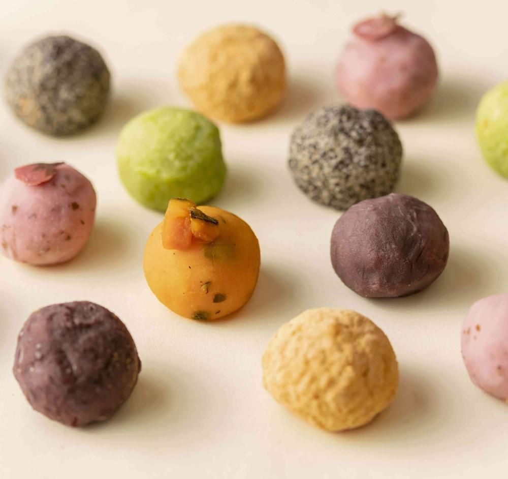 曲げわっぱの中に、七つの福がいっぱいに詰まったカラフルで可愛らしいミニおはぎセットです。
